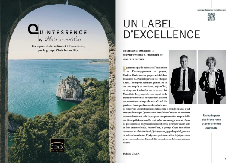 Quintessence Immobilier, marque de prestige du groupe CHAIX Immobilier, est un univers dédié au luxe et à l’excellence. Nous vous proposons à la fois une sélection de biens immobiliers rares et recherchés sur les communes à l’Est de Marseille et jusqu’au Var (Aubagne, Gémenos, La Ciotat, Roquevaire, Cassis, Eoures, Auriol,…) mais aussi des partenaires symbolisant le Haut de Gamme réunis autour du Club Quintessence.