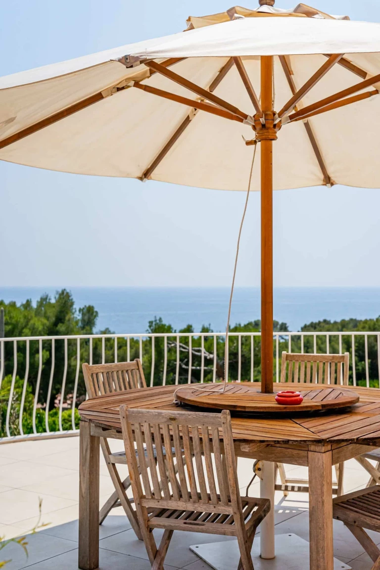 Lumineuse et chaleureuse, elle comprend un séjour avec cuisine ouverte donnant sur une grande terrasse face à la Méditerranée, une chambre avec dressing et salle d’eau, ainsi qu’un appartement de type T1 indépendant pouvant être relié à l'habitation principale.