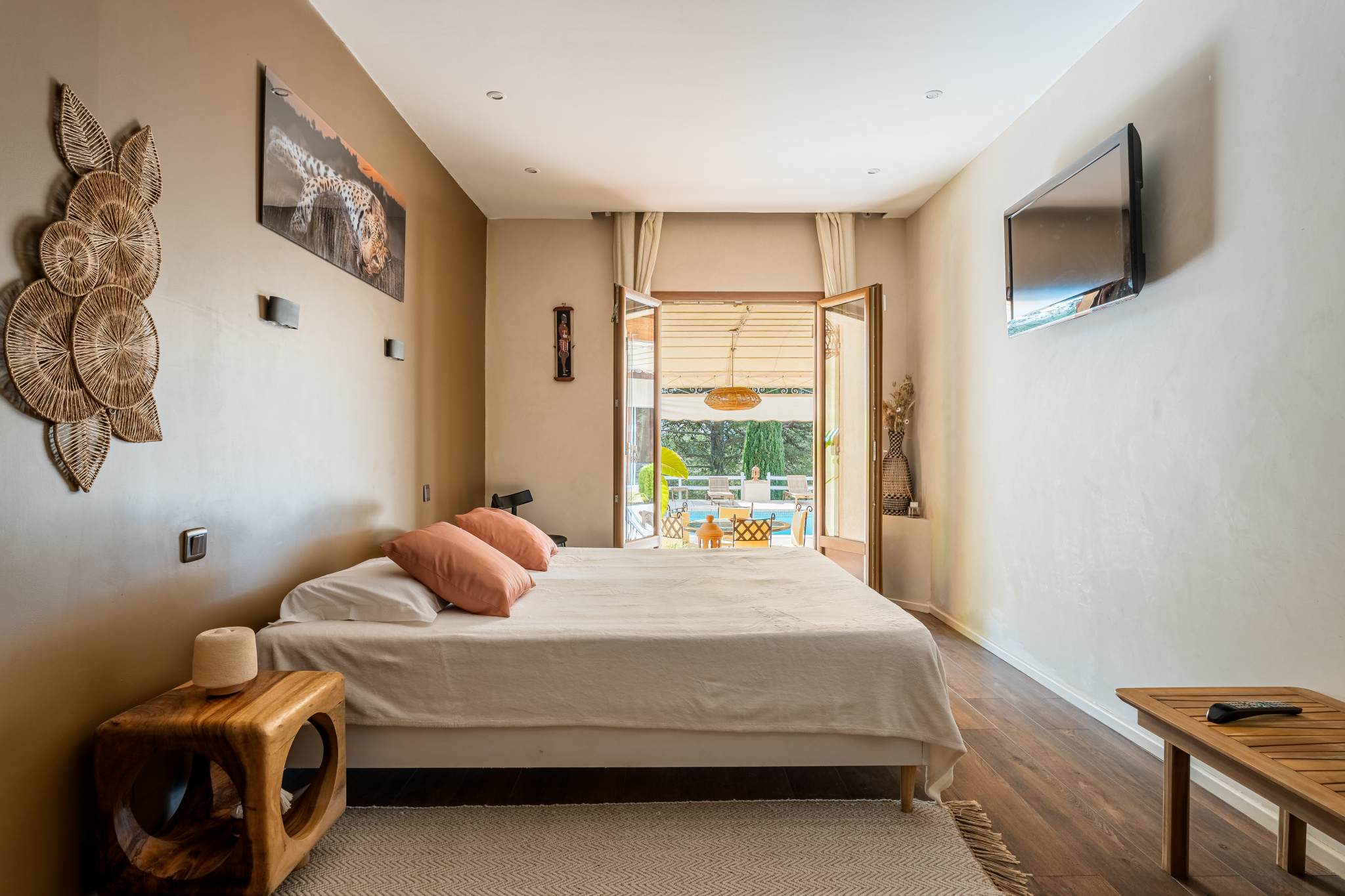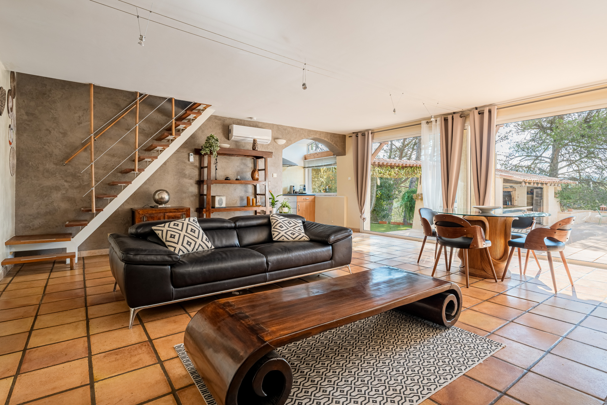 A l'étage une mezzanine qui fait office de bureau, une terrasse tropézienne et un grenier pour du rangement.