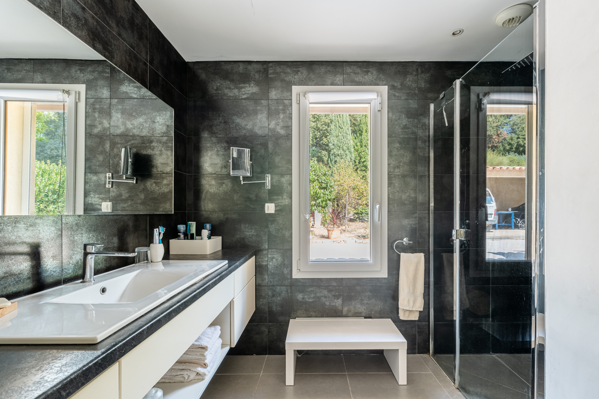 Carport double, deux portails, un double garage sous la maison de 39m2. Aucun vis à vis. Nombreux oliviers. Un bien exceptionnel de par sa position, ses volumes et ses prestations.